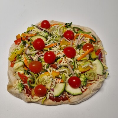 OVEN VOORVERWARMEN 8 MINUTEN 220 GRADEN ,BROOD KAAS, GROENTEN, PIZZASAUS, OREGANO, TOMAAT. AMBACHTELIJKE PIZZABODEM 72 UUR LANG GERUST VOOR MAXIMALE FERMENTATIE. GLUTEN, MELK, MOSTERD, SOJA, LUPINE, SELDERIE