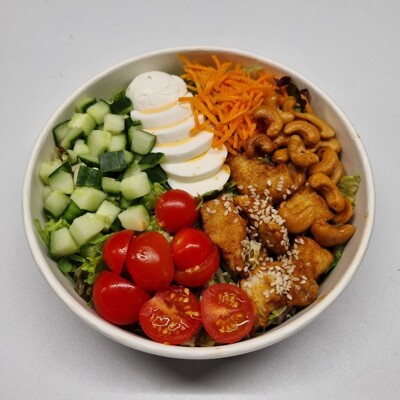sla, komkommer, ei, wortel, tomaat, kip, cashewnoten, sesamzaadjes