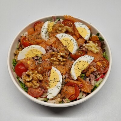 sla, komkommer,radijs, wa;lnoot, spek, EI, tomaat, zalm , Dille
