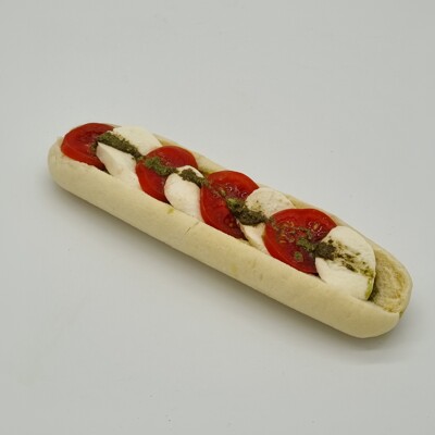 stokbrood, pesto, tomaat, mozzarella, pijnboompitten