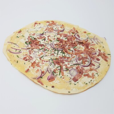 flamkuchen, roomkaas, spek, ui