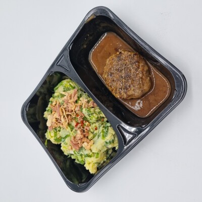 aardappel, andijvie, diverse vlees, spekreepjes, jus