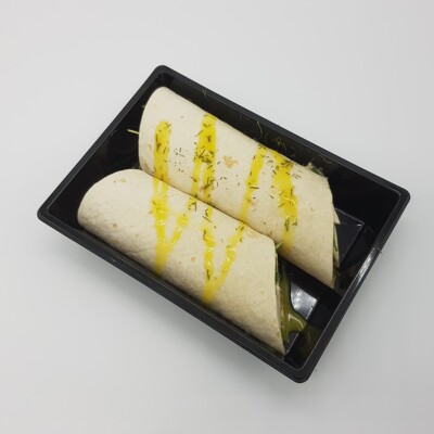wrap, zalm, vissaus, rucola, wortel, mosterd dille