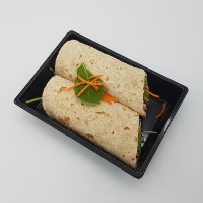volkoren wrap, spinazie, huttekase, paprika, rode ui, wortel, yoghurt bieslook